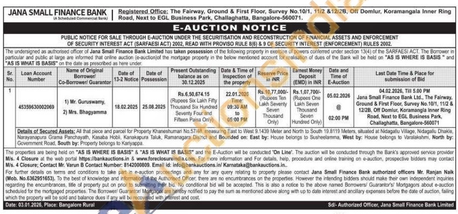 Details of Secured Assets: All that piece and parcel for Property Khaneshuman No.57/48, measuring East to West 9.1439 Meter and North to South 19.8119 Meters, situated at Nidagallu Village, Nidagaliu Dhakle, Narayanapura Grama Panchayath, Kasaba Hobli, Kanakapura Taluk, Ramanagara District and Bounded on: East by: House belongs to Susheelamma, West by: House belongs to Varalakshmi, North by: Government Road, South by: Property belongs to Kariyappa