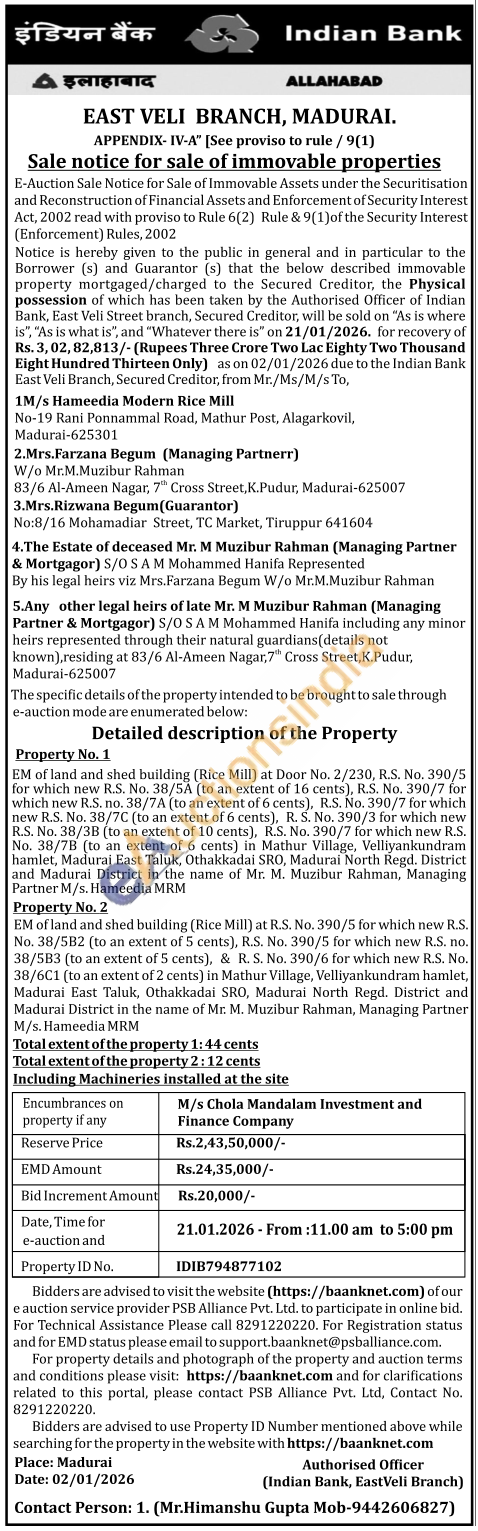 Property No. 1 EM of land and shed building (Rice Mill) at Door No. 2/230, R.S. No. 390/5 for which new R.S. No. 38/5A (to an extent of 16 cents), R.S. No. 390/7 for which new R.S. no. 38/7A (to an extent of 6 cents), R.S. No. 390/7 for which new R.S. No. 38/7C (to an extent of 6 cents), R. S. No. 390/3 for which new R.S. No. 38/3B (to an extent of 10 cents), R.S. No. 390/7 for which new R.S. No. 38/7B (to an extent of 6 cents) in Mathur Village, Velliyankundram hamlet, Madurai East Taluk, Othakkadai SRO, Madurai North Regd. District and Madurai District in the name of Mr. M. Muzibur Rahman, Managing Partner M/s. Hameedia MRM Property No. 2 EM of land and shed building (Rice Mill) at R.S. No. 390/5 for which new R.S. No. 38/5B2 (to an extent of 5 cents), R.S. No. 390/5 for which new R.S. no. 38/5B3 (to an extent of 5 cents), & R. S. No. 390/6 for which new R.S. No. 38/6C1 (to an extent of 2 cents) in Mathur Village, Velliyankundram hamlet, Madurai East Taluk, Othakkadai SRO, Madurai North Regd. District and Madurai District in the name of Mr. M. Muzibur Rahman, Managing Partner M/s. Hameedia MRM