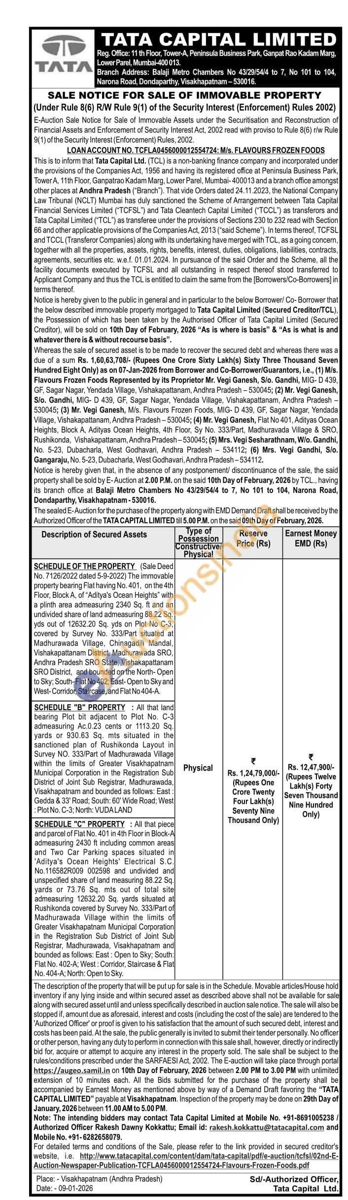 SCHEDULE OF THE PROPERTY (Sale Deed No. 7126/2022 dated 5-9-2022) The immovable property bearing Flat having No. 401, on the 4th Floor, Block A, of "Aditya's Ocean Heights" with a plinth area admeasuring 2340 Sq. ft and an undivided share of land admeasuring 88.22 Sq. yds out of 12632.20 Sq. yds on Plot No C-3, covered by Survey No. 333/Part situated at Madhurawada Village, Chinagadili Mandal, Vishakapattanam District, Madhurawada SRO, Andhra Pradesh SRO State, Vishakapattanam SRO District, and bounded on the North-Open to Sky; South-Flat No 402; East- Open to Sky and West-Corridor, Staircase, and Flat No 404-A.