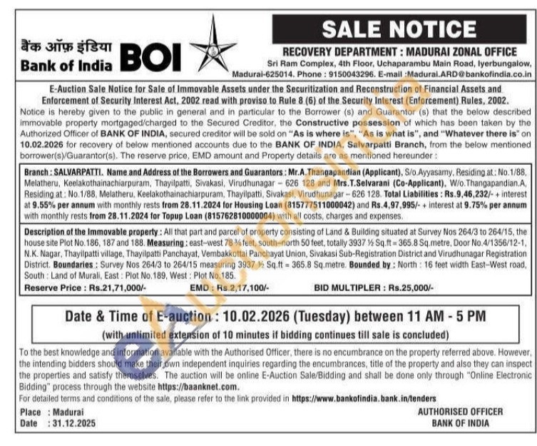 Description of the Immovable property: All that part and parcel of property consisting of Land & Building situated at Survey Nos 264/3 to 264/15, the house site Plot No. 186, 187 and 188. Measuring: east-west 78% feet, south-north 50 feet, totally 3937 ½ Sq.ft 365.8 Sq.metre, Door No.4/1356/12-1, N.K. Nagar, Thayilpatti village, Thayilpatti Panchayat, Vembakkottai Panchayat Union, Sivakasi Sub-Registration District and Virudhunagar Registration District. Boundaries: Survey Nos 264/3 to 264/15 measuring 3937 1 Sq.ft 365.8 Sq.metre. Bounded by: North: 16 feet width East-West road, South: Land of Murali, East: Plot No. 189, West: Plot No. 185.