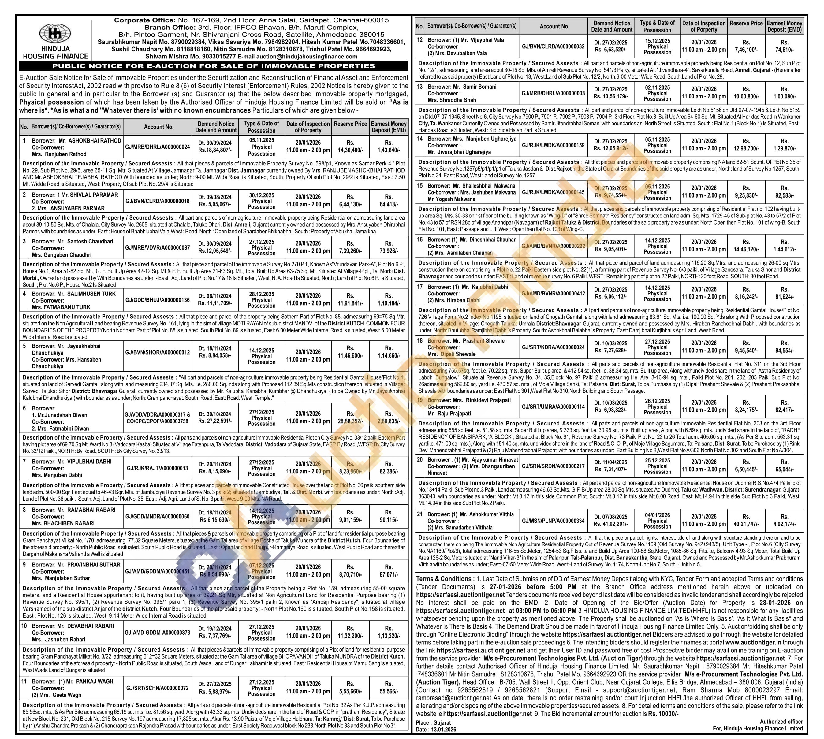 Description of the Immovable Property / Secured Assests: All that the piece or parcel, rights, interest, title of land along with structure standing there on and to be constructed there on being The Immovable Non Agriculture Residential Property Out of Revenue Survey No. 1169 (Old Survey No. 942+943/5), Unit Type -I, Plot No.6 (City Survey No.NA1169/Plot/6), total admeasuring 116-55 Sq.Meter, 1254-53 Sq. Fitss.i.e and Build Up Area 100-88 Sq.Meter, 1085-86 Sq. Fits.i.e, Balcony 4-93 Sq.Meter, Total Build Up Area 126-2 Sq.Meter situated at "Nand Vihar-3" in the sim of Palanpur, Tal:-Palanpur, Dist. Banaskantha, State: Gujarat. Owned and Possessed by Mr.Ashokkumar Prabhuram Vitthla with boundaries as under; East:-07-50 Meter Wide Road, West:-Land of Survey No. 1174, North-Unit No.7, South:-Unit No.5.