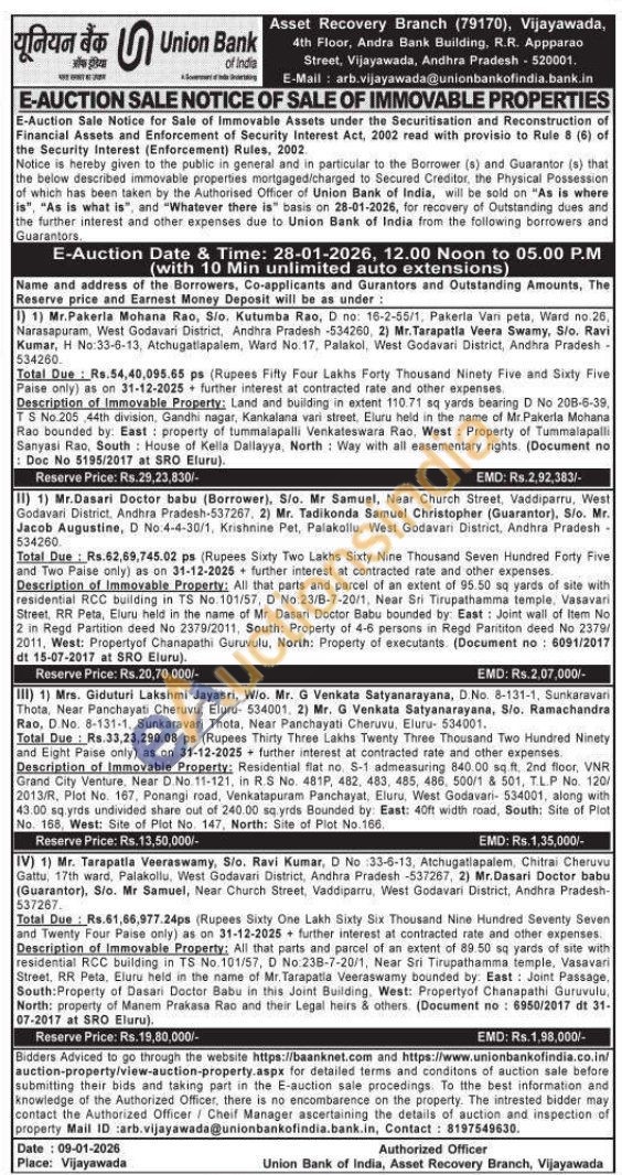Description of Immovable Property; Land and building in extent 110.71 sq yards bearing D No 20B-6-39, TS No.205 44th division, Gandhi nagar, Kankalana vari street, Eluru held in the name of Mr.Pakerla Mohana Rao bounded by. East property of tummalapalli Venkateswara Rao, West: Property of Tummalapalli Sanyasi Rao, South House of Kella Dallayya North Way with all easementary rights (Document no Doc No 5195/2017 at SRO Eluru).