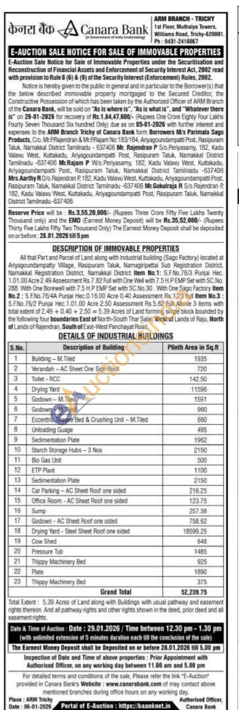 All that Part and Parcel of Land along with Industrial building (Sago Factory) located at Ariyagoundampatty Village, Rasipuram Taluk, Namagiripettai Sub Registration District, Namakkal Registration District, Namakkal District Item No.1: S.F.No. 76/3 Punjai Hec. 1.01.00 Acre 2.49 Assessment Rs.7.82 Full with One Well with 7.5 H.PEMP Set with SC.No. 288. With One Borewell with 7.5 H.P EMP Set with SC.No.30. With One Sago Factory Item No.2: S.F.No.76/4A Punjai Hec. 0.16.00 Acre 0.40 Assessment Rs. 1.23 Full Item No.3: S.F.No 76/2 Punjal Hec 1.01.00 Acre 2.50 Assessment Rs.5.62 Full Above 3 items with total extent of 2.49+0.40+2.50 5.39 Acres of Land forming single block bounded by the following four boundaries East of North-South Thar Salai, West of Lands of Raju, North of Lands of Rajendran, South of East-West Panchayat Road.
