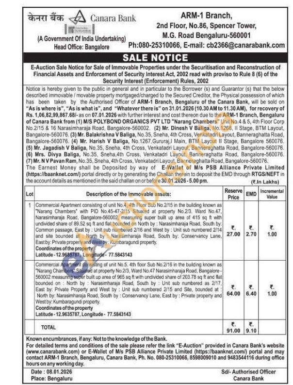 Commercial Apartment consisting of unit No.5. 4th floor Sub No.2/16 in the building known as "Narang Chambers" Situated at property No 2/3, Ward No.47 Narasimharaja Road, Bangalore-560002 measuring super built up area of 965 sq ft with undivided share of 203.78 sq ft and flat bounded on North by Narasimharaja Road, South by Unit sub numbered as 2/17, East by: Private Property and West by Unit sub numbered 2/15 and Site, bounded at: North by: Narasimharaja Road, South by: Conservancy Lane, East by: Private property and West by: Kumbaragundi property.