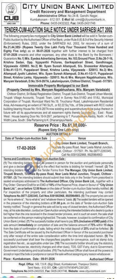 Tirupati Village Accounts, Tirupati Town, Land in Survey Nos.51.8D and 51/6J, Municipal Corporation of Tirupati, Municipal Ward No. 19. Tiruchanur Road, Lakshmipuram Residential Area, Ad-measuring an extent of 740 Sq.ft., or 82.22 Sq. Yds,, of Site present with RCC roofed building bearing House No. 19-9-28/7A now existing and superstructure to be putup thereon in future with all its appurtenances and all easement rights thereto bounded by: East: Road West: House bearing Door No. 19-9-28/7, pertaining to T. Purushotham Reddy, North: 4 Feet Width Lane, South: Site Pertaining to K. Dhanamjaya Naidu