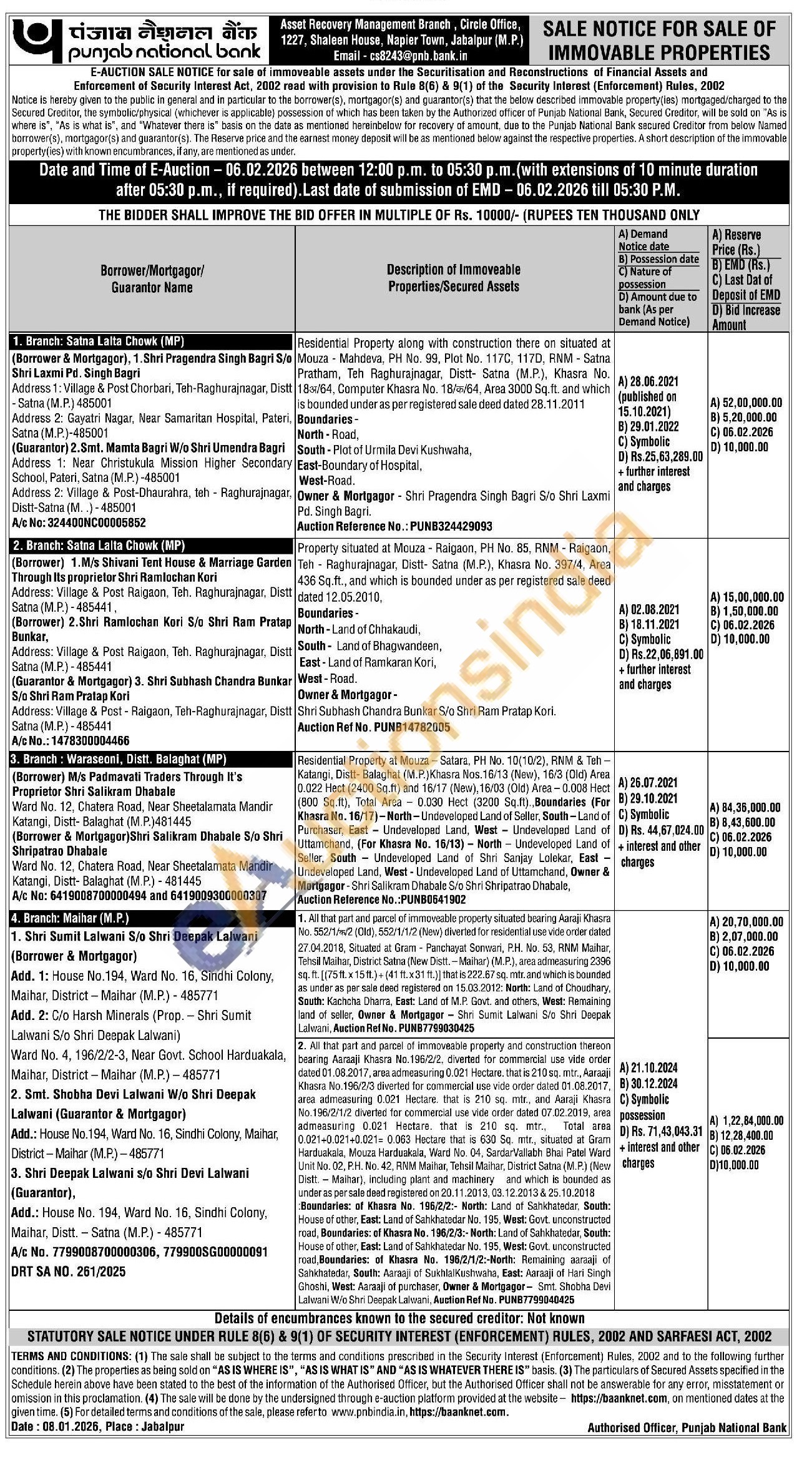 3) Residential Property al Mouza-Satara, PH No. 10(10/2), RNM & Teh-Katangi, Distt-Balaghat (M.P.) Khasra Nos. 16/13 (New), 16/3 (Old) Area 0.022 Hect (2400 Sq.ft) and 16/17 (New), 16/03 (Old) Area-0.008 Hect (800 Sq.ft), Total Area 0.030 Hect (3200 Sq.ft). Boundaries (For Khasra No. 16/17)-North-Undeveloped Land of Seller, South-Land of Purchaser, East Undeveloped Land, West Undeveloped Land of Uttamchand, (For Khasra No. 16/13) North Undeveloped Land of Seller, South Undeveloped Land of Shri Sanjay Lolekar, East Undeveloped Land, West - Undeveloped Land of Uttamchand, Owner & Mortgager-Shri Salikram Dhabale S/o Shri Shripatrao Dhabale, Auction Reference No.: PUNB0541902