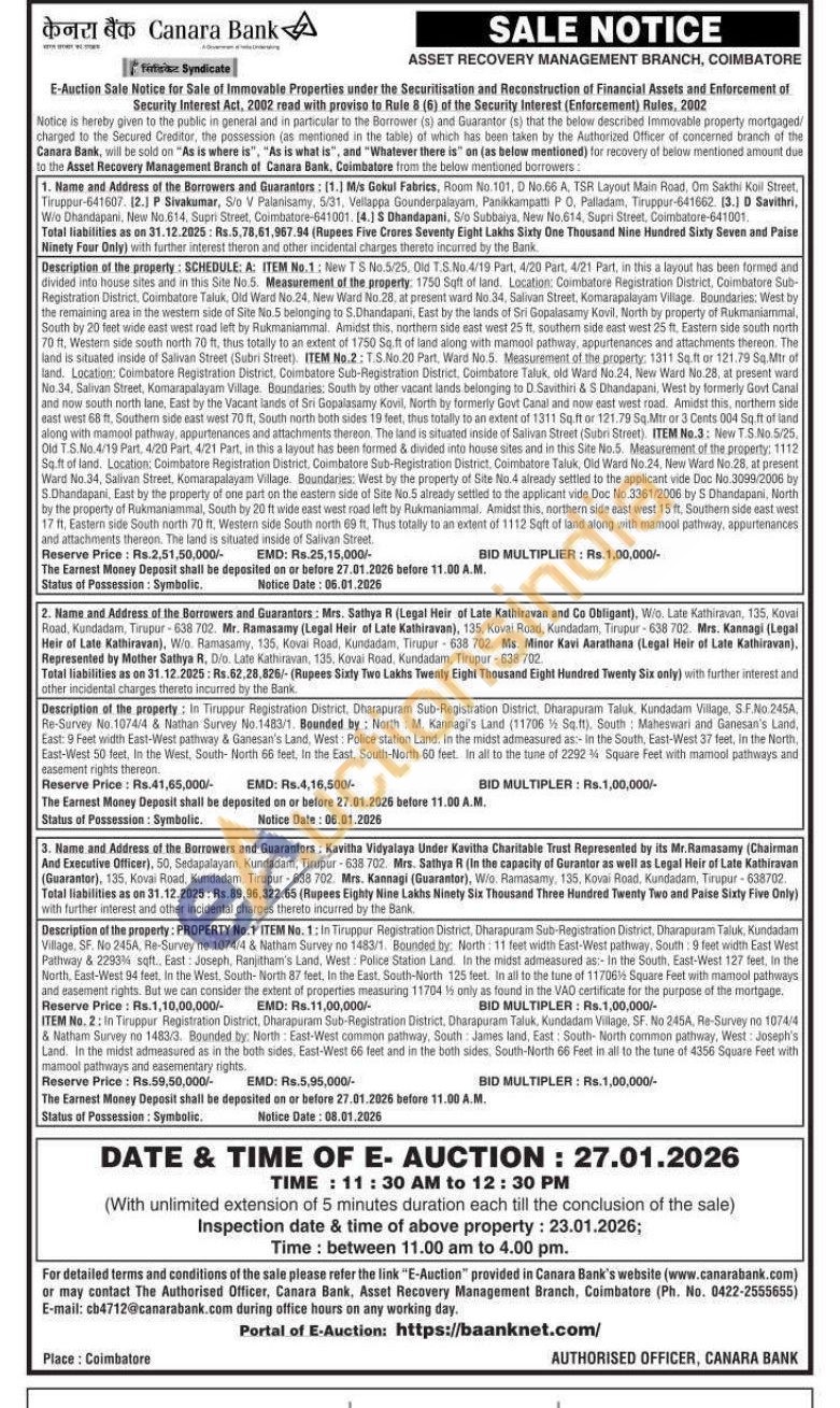 In Tiruppur Registration District, Dharapuram Sub-Registration District, Dharapuram Taluk, Kundadam Village SF. No 245A. Re-Survey no 1074/4 & Nathan Survey no 1483/1. Bounded by: North: 11 feet width East-West pathway, South: 9 feet width East West Pathway & 2233% sqft., East Joseph, Ranjitham's Land, West: Police Station Land in the midst admeasured as: In the South, East-West 127 feet, in the North. East-West 94 feet, in the West, South-North 87 feet, in the East, South-North 125 feet. In all to the tune of 117064 Square Feet with mamool patinays and easement rights. But we can consider the extent of properties measuring 11704 15 only as found in the VAD certificate for the purpose of the mortgage