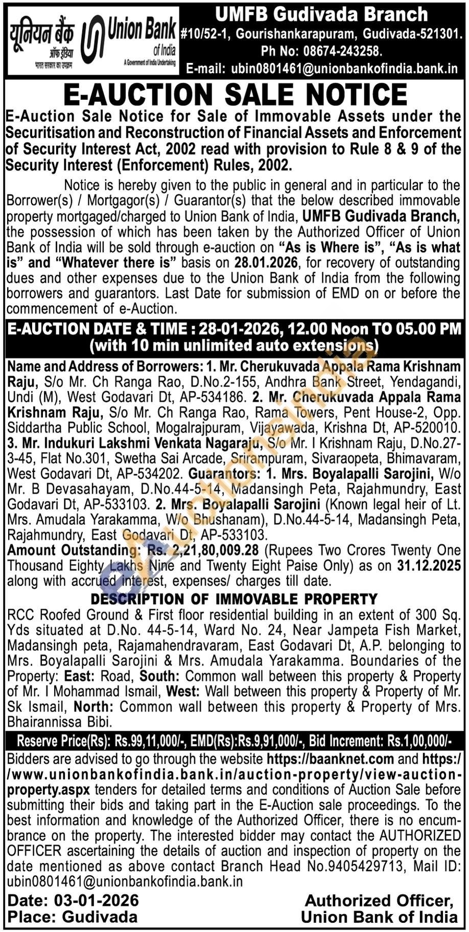 RCC Roofed Ground & First floor residential building in an extent of 300 Sq. Yds situated at D.No. 44-5-14, Ward No. 24, Near Jampeta Fish Market, Madansingh peta, Rajamahendravaram, East Godavari Dt, A.P. belonging to Mrs. Boyalapalli Sarojini & Mrs. Amudala Yarakamma. Boundaries of the Property: East: Road, South: Common wall between this property & Property of Mr. I Mohammad Ismail, West: Wall between this property & Property of Mr. Sk Ismail, North: Common wall between this property & Property of Mrs. Bhairannissa Bibi.