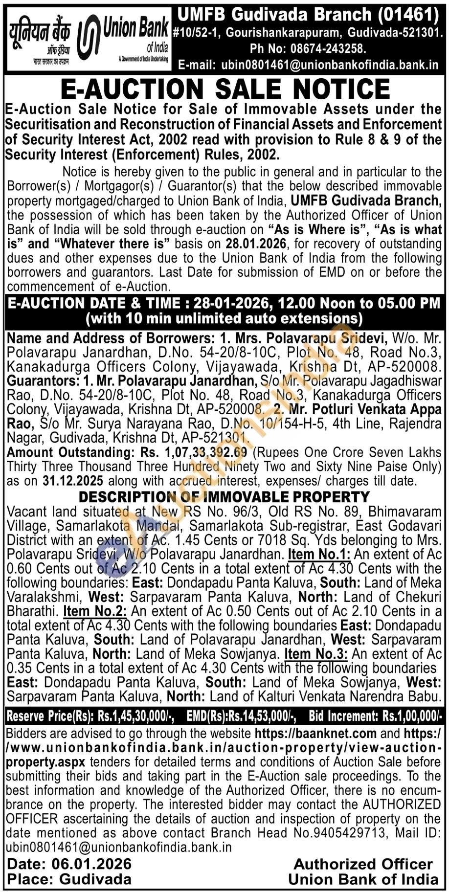 Vacant land situated at New RS No. 96/3, Old RS No. 89, Bhimavaram Village, Samarlakota Mandal, Samarlakota Sub-registrar, East Godavari District with an extent of Ac. 1.45 Cents or 7018 Sq. Yds belonging to Mrs. Polavarapu Sridevi, W/o Polavarapu Janardhan. Item No.1: An extent of Ac 0.60 Cents out of Ac 2.10 Cents in a total extent of Ac 4.30 Cents with the following boundaries: East: Dondapadu Panta Kaluva, South: Land of Meka Varalakshmi, West: Sarpavaram Panta Kaluva, North: Land of Chekuri Bharathi. Item No.2: An extent of Ac 0.50 Cents out of Ac 2.10 Cents in a total extent of Ac 4.30 Cents with the following boundaries East: Dondapadu Panta Kaluva, South: Land of Polavarapu Janardhan, West: Sarpavaram Panta Kaluva, North: Land of Meka Sowjanya. Item No.3: An extent of Ac 0.35 Cents in a total extent of Ac 4.30 Cents with the following boundaries East: Dondapadu Panta Kaluva, South: Land of Meka Sowjanya, West: Sarpavaram Panta Kaluva, North: Land of Kalturi Venkata Narendra Babu