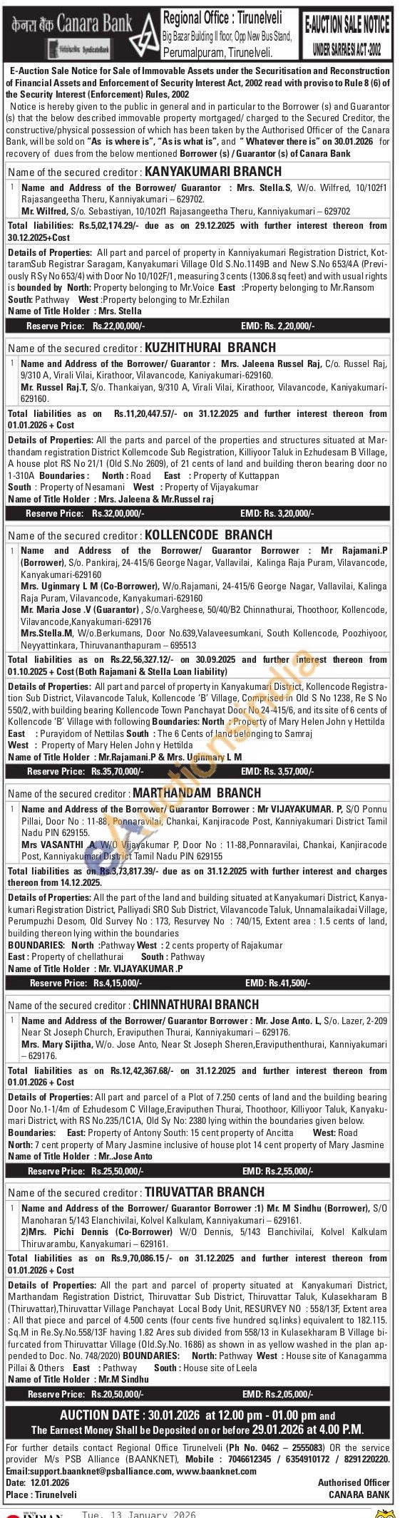 2) All the parts and parcel of the properties and structures situated at Mar-thandam registration District Kollemcode Sub Registration, Killiyoor Taluk in Ezhudesam B Village, A house plot RS No 21/1 (Old S.No 2609), of 21 cents of land and building theron bearing door no 1-310A Boundaries: North Road East Property of Kuttappan South Property of Nesamani West Property of Vijayakumar Name of Title Holder: Mrs. Jaleena & Mr.Russel raj