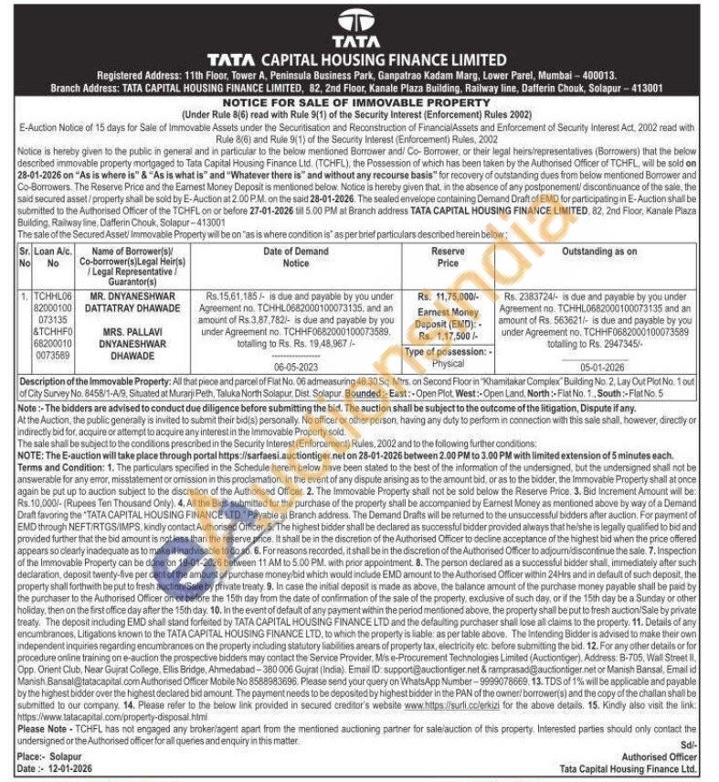 Description of the Immovable Property: All that piece and parcel of Flat No. 06 admeasuring 48.30 Sq. Mitrs, on Second Floor in "Khamilakar Complex" Building No. 2, Lay Out Plot No. 1 out of City Survey No. 8458/1-A/9, Situated at Murarji Peth, Taluka North Solapur, Dist. Solapur Bounded:-East: Open Plot, West: Open Land, North: Flat No. 1., South:-Flat No. 5