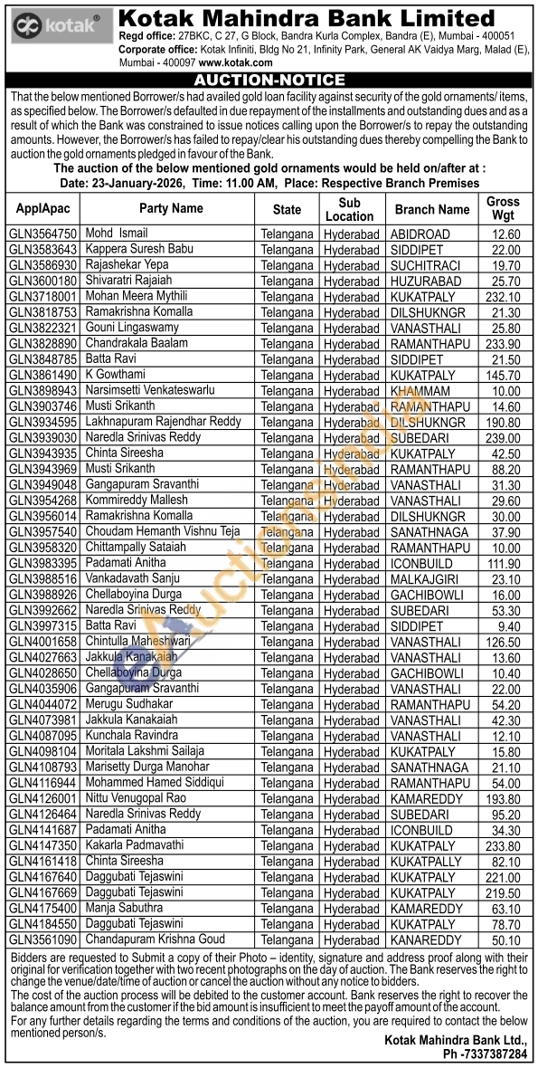 Kotak Mahindra Bank Gold Auctions Auction in Hyderabad