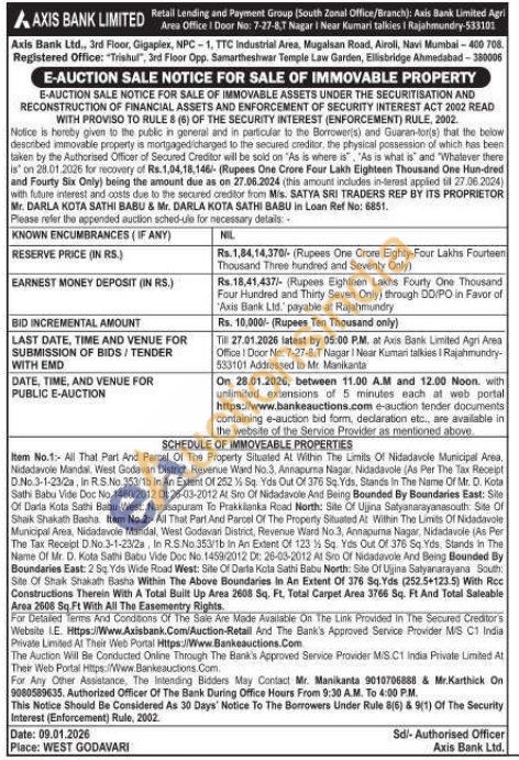 SCHEDULE OF IMMOVEABLE PROPERTIES : Item No.1:- All That Part And Parcel Of The Property Situated At Within The Limits Of Nidadavole Municipal Area, Nidadavole Mandal, West Godavari District Revenue Ward No.3. Annapurma Nagar, Nidadavole (As Per The Tax Receipt D.No. 3-1-23/2a, in R.S.No.353/1b In An Extent Of 252 1/2 Sq. Yds Out Of 376 Sq. Yds, Stands in The Name Of Mr. D. Kota Sath Babu Vide Doc No. 1460/2012 Dt: 26-03-2012 At Sro Of Nidadavole And Being Bounded By Boundaries East: Sile Of Darla Kota Sathi Babu West: Narasapuram To Prakkilankas Road North: Site Of Ujjina Satyanarayanasouth: Site Of Shaik Shakath Basha, Item No.2:- All That Part And Parcel Of The Property Situated At Within The Limits Of Nidadavole Muniopal Area, Nidadavole Mandal, West Godavari District, Revenue Ward No.3, Annapuma Nagar, Nidadavole (As Per The Tax Receipt D.No.3-1-23/2s, In R.S .No 353/1b in An Extent Of 123 1/2 Sq. Yids Out Of 376 Sq. Yds. Stands in The Name Of Mr. D. Kota Sathi Babu Vide Doc No. 1459/2012 Dt: 26-03-2012 At Sro Of Nidadavole And Being Bounded By Boundaries East: 2 Sq. Yds Wide Road West: Site Of Darla Kota Sathi Babu North: Site Of Uljina Satyanarayana South: Site Of Shak Shakath Basha Within The Above Boundaries in An Extent Of 376 Sq. Yds (252.5+123.5) With Roc Constructions Therein With A Total Built Up Area 2608 Sq. Ft, Total Carpet Area 3766 Sq. Ft And Total Saleable