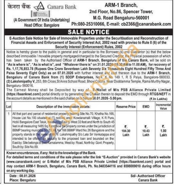All that part and parcel of residential property bearing Site No.70, Khatha No. 166, House List No. 193 situated at ITI notified area, Kowdanahalli Village, KR. Pura, Hobli Bangalore East Taluk, measuring East to West 33 feet and North to South 45 feet in all measuring 1485 Sq.ft and now the property comes under the jurisdiction of BBMP bearing municipal No 70, HL. No. 166 88MP Ward No.26 Bangalore and the property stands in the name of Mr. V. Lakshmipathy Sio Late Sri Venkatappa and intended to be offered as security to the proposed loan and bounded on the East by: Site belongs to Smt. Kamalamma, West by: Road, North by: Govt. Property, South by: Site No.69.