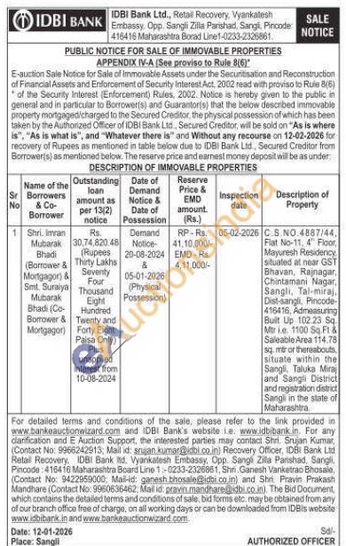 C.S.NO.4887/44, Flat No-11, 4 Floor, Mayuresh Residency. situated at near GST Bhavan, Rajnagar, Chintamani Nagar, Sangli, Tal-miraj, Dist-sangli, Pincode 416416, Admeasuring Built Up 102.23 Sq Mtr i.e. 1100 Sq.Ft & Saleable Area 114.78. sq. mtr or thereabouts, situate within the Sangli, Taluka Miraj and Sangli District and registration district Sangli in the state of Maharashtra.
