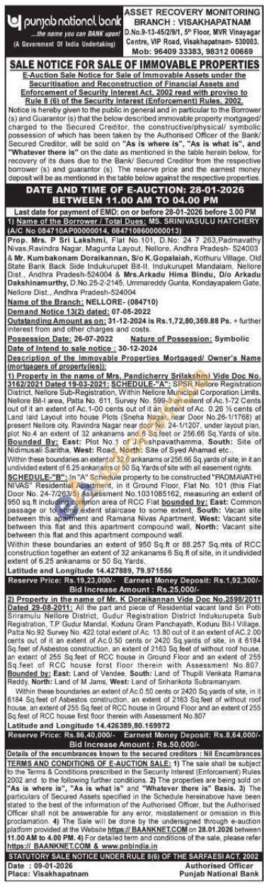 SCHEDULE-"A": SPSR Nellore Registration District, Nellore Sub-Registration, Within Nellore Municipal Corporation Limits. Nellore Bit-i area, Patta No. 611, Survey No. 599-3 an extent of Ac. 1-72 Cents out of it an extent of Ac. 1-00 cents out of it an extent of Ac. 0.26% cents of Land laid Layout into house Plots (Sneha Nagar, near Door No.26-1/1768) at present Nellore city. Ravindra Nagar near door No. 24-1/1207, under layout plan, plot No.4 an extent of 32 ankanams and 6 Sq.feet or 256.66 Sq. Yards of site. Bounded By: East: Plot No.1 of J.Pushpavathamma, South: Site of Nidimusali Saritha, West: Road, North: Site of Syed Ahamad etc.. Within these boundaries an extent of 32.5 ankanams or 256.66 Sq. yards of site, in it an undivided extent of 6.25 ankanams or 50 Sq. Yards of site with all easement rights SCHEDULE-"B": In "A" Schedule property to be constructed "PADMAVATHI NIVAS Residential Apartment, in it Ground Floor, Flat No. 101 (this Flat Door No. 24-7/263/5) Assessment No. 1031085162, measuring an extent of 950 sq.ft including common area of RCC Flat bounded by: East: Common passage or to some extent staircase to some extent, South: Vacan site between this apartment and Ramana Nivas Apartment, West: Vacant site between this flat and this apartment compound wall, North: Vacant site between this flat and this apartment compound wall. Within these boundaries an extent of 950 Sq.ft or 88.257 Sq.mts of RCC construction together an extent of 32 ankanams 6 Sq.ft of site, in it undivided extent of 6.25 ankanams or 50 Sq. Yards.