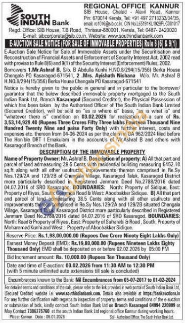 DESCRIPTION OF THE IMMOVABLE PROPERTY : Name of Property Owner: Mr. Ashraf B. Description of property: A) All that part and parcel of land admeasuring 29.5 Cents with residential building measuring 6452.10 sq.ft along with all other usufructs, improvements thereon comprised in Re.Sy Nos. 129/24 and 129/28 of Chengala Village, Kasaragod Taluk, Kasaragod District more particularly described in Registered Jenmam Deed No.2788/2016 dated 04.07.2016 of SRO Kasaragod. BOUNDARIES: North: Property of Sidique, East: Property of Riyas, South: Common Road & West: Aboobakker Sidique. B) All that part and parcel of land admeasuring 38.5 Cents along with all other usufructs and improvements thereon comprised in Re. Sy Nos. 129/2A and 129/28 situated Chengala Village, Kasaragod Taluk, Kasaragod District more particularly described in Registered Jenmam Deed No.2788/2016 dated 04.07.2016 of SRO Kasaragod, BOUNDARIES: North: Road & Property of Rivas, East: Property of Suharabi & Road, South: Property of Muhammed Kunhi and West: Property of Aboobakker Sidique