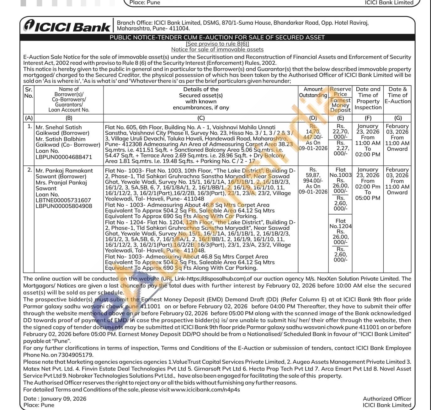 Flat No-1003- Flat No. 1003, 10th Floor, "The Lake District", Building D-2, Phase-1, Tld Sahkari Gruhrachna Sanstha Maryadit", Near Saswad Ghat, Yewale Wadi, Survey No. 15/1, 16/1/1A, 16/1/18/1, 2, 16/18/2/3, 16/1/2, 3, 5A,5B, 6, 7, 16/1/8A/1, 2, 16/1/8B/1, 2, 16/1/9, 16/1/10, 11, 16/1/12/2, 3, 16/2/1(Part),16/2/2B, 16/3(Part), 23/1, 23/A, 23/2, Village Yeolewadi, Tal- Haveli, Pune-411048 Flat No-1003- Admeasuring About 46.8 Sq Mtrs Carpet Area Equivalent To Approx 504.2 Sq Fts, Saleable Area 64.12 Sq Mtrs Equivalent To Approx 690 Sq Fts Along With Car Parking.