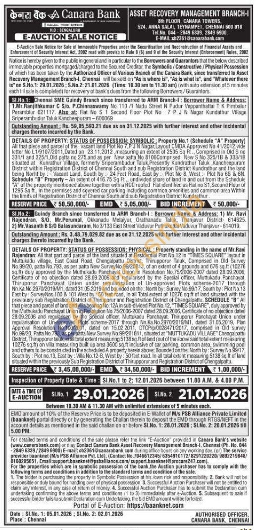 2) All that part and parcel of the land situated at Residential Plot No. 12 in "TIMES SQUARE" layout in Muttukadu village, East Coast Road, Chengalpattu District, Thirupporur Taluk, Comprised in Old Survey No.99/20, patta No. 793, as per patta New SurveyNo.99/2081.J, of an extent of 4 grounds and 676 sq.ft (10276 sq.ft) duly approved by the Muthukadu Panchayat Union in Resolution No. 75/2006-2007 dated 28.09.2006, Certificate of no objection dated 28.09.2006 and regularised by the Special officer, Muttukadu Panchayat. Thiruporur Panchayat Union under regularisation of Un-approved Plots scheme-2017 through Nn. Ka. No. 2970/2019/M1, dated 31.05.2019 and bounded on the North by Survey No 99/17, South by: Plot No.13 East by: Survey/Nos. 100 & 101 West by: 50 feet road, in all Total extent of 10276 sq.ft of land situated with the previously sub Registration District of Thiruporur and Registration District of Chengalpattu. SCHEDULE "B" All that piece and parcel of land and villa bearing No. 124 in sub-divided Plot No. 12, "TIMES SQUARE", duly approved by the Muthukadu Panchayat Union in Resolution No. 75/2006-2007 dated 28.09.2006, Certificate of no objection dated 28.09.2006 and regularised by the Special officer, Muttukadu Panchayat. Thiruporur Panchayat Union under regularisation of Un-approved Plots scheme-2017 through Nn.Ka.No.2970/2019/M1, dated 31.05.2019, Plan Approval Resolution No 100/2011, dated on 15.02.2011, DTCP/p/0028471/2017, comprised in Old survey No.99/20, Patta No.793, as per patta New Survey No.99/201811, situated at "MUTTUKADU VILLAGE Chengalpattu District, Thirupporurtaluk, in all total extent measuring 5138 sq.ft of land (out of the above said total extent measuring 10276 sq.ft) on villa measuring built up area 3600 sq.ft inclusive of car parking, common area, swimming pool and others to be constructed in the scheduled A property herein above, Bounded on the North by: Survey No 99/17, South by Plot no. 13, East by: Villa No. 12-B, West by: 50 feet road. In all total extent measuring total extent measuring 5138 sq.ft of land situated within the previously Sub Registration District of Thirupporur and Registration District of Chengalpattu