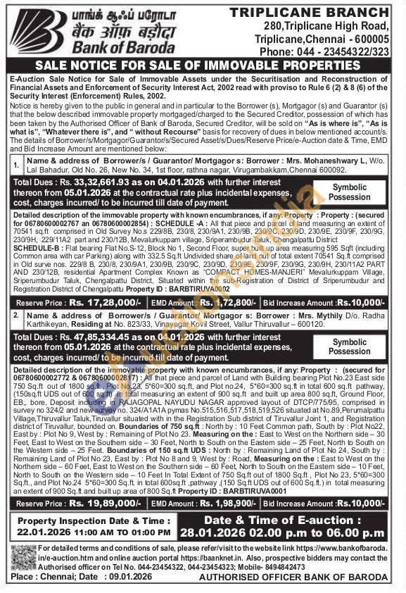 SCHEDULE-A: All that piece and parcel of land measuring an extent of 70541 sq.ft comprised in Old Survey Nos 229/8B, 230/8, 230/9A1, 230/98, 230/90, 230/90, 230/9E, 230/9F, 230/9G, 230/9H, 229/11A2 part and 230/12B, Mevalurkuppam village, Sriperambudur Taluk, Chengalpattu District SCHEDULE-B: Flat bearing Flat No.S-12, Block No 1, Second Floor, super built up area measuring 595 Sqft (including Common area with car Parking) along with 332.5 Sq.ft Undivided share of land out of total extent 70541 Sq.ft comprised in Old surve nos. 229/8 B, 230/8, 230/9A1, 230/98, 230/90, 230/90, 230/9E, 230/9F, 230/96, 230/9H, 230/11A2 PART AND 230/12B, residential Apartment Complex Known as "COMPACT HOMES-MANJERI" Mevalurkuppam Village, Sriperumbudur Taluk, Chengalpattu District, Situated within the sub-Registration of District of Sriperumbudur and Registration District of Chengalpattu