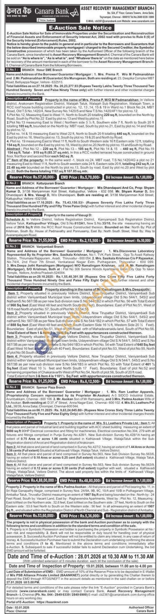 1) in Vellore district, Arakonam Registration District, Walajah Taluk, Walajah Sub Registration, Walajah Town, a RCC roof house building constructed in plot no. 12, 13.14, 15 & 19 in Ward no.1 Block No 24, MBT Road, Old T.S No. 1420/4, New Survey No. 1420/5 and New T.S No. 1420/4F1 for plot no. 12. 1.Plot No. 12, Measuring East to West 11, North to South 20 totalling 220 sq.ft, bounded on the North by Road, South by Plot No 22 East by plot no. 13 and West by plot no.11 2.Plot No.13 measuring East to West (Northern side 33% ft. Southern side 7 ft. North to South 20 ft totalling 105 sq.ft, bounded on the North by: MBT road, South by plot no.21, East by plot no. 14 and West by plotno. 12. 3.Plot no. 14 & 15 measuring East to West 22 ft. North to South 20 ft totalling 440 sq.ft, bounded on the East by plotno. 16, West by plot no. 13, South by plot no. 19 & 20 and North by Road. 4. Plot no. 19 measuring East to West 11 ft. North to South Western side 16 ft Eastern side 12 ft, totalling 154 sq.ft, bounded on the East by plot no. 18, West by plot no.20, North by plot no 15 and South by Road. Abstract: Plot No. 12-220 sq ft, Plot No. 13-105 sq ft, Plot No 14 & 15440 sq ft, Plot No. 19. 154 sq ft. Total- 919 sq ft (85.37 sq.mtr). In this a RCC roofed terraced house constructed in ground floor, first floor and second floor each 542 sq.ft. 2 Item of the property; In the same ward -1, block no.24, MBT road, TS No. 1420/4G a plot no 21 measuring East to West 11 ft, North to South westem side 24 ft. Eastern side 20 ft, totalling 242 sq.ft, i.e 22.48 sq.mtr bounded on the North by plot no.13, South by road, East by plot no.20 and West by plot no.22. Both the items totaling 1161 sq.ft 107.85 sq.mtr.