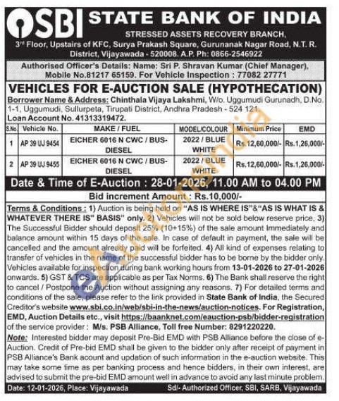 Contact Authorised Officer's Details: Name: Sri P. Shravan Kumar (Chief Manager), Mobile No.81217 65159. For Vehicle Inspection: 77082 27771