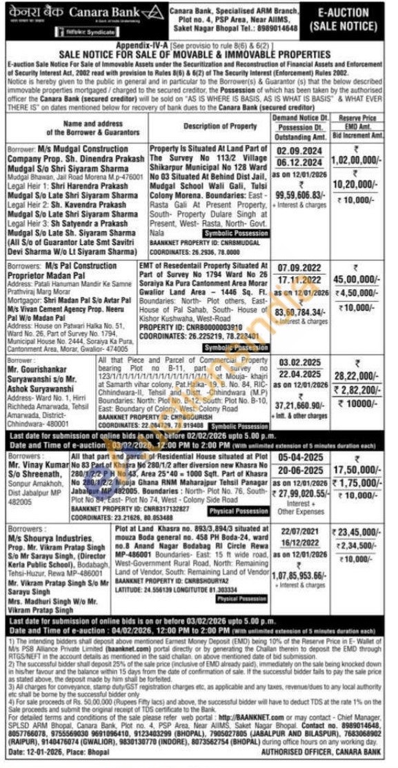 Property Is Situated At Land Part of The Survey No 113/2 Village Shikarpur Municipal No 128 Ward No 03 Situated At Behind Dist Jail, Mudgal School Wali Gali, Tulsi Colony Morena. Boundaries: East Rasta Gali At Present Property, South Property Dulare Singh at Present, West- Rasta, North Govt. Nala Symbolic Possession BAANKNET PROPERTY ID: CNRBMUDGAL COORDINATES: 26.2936, 78.0000