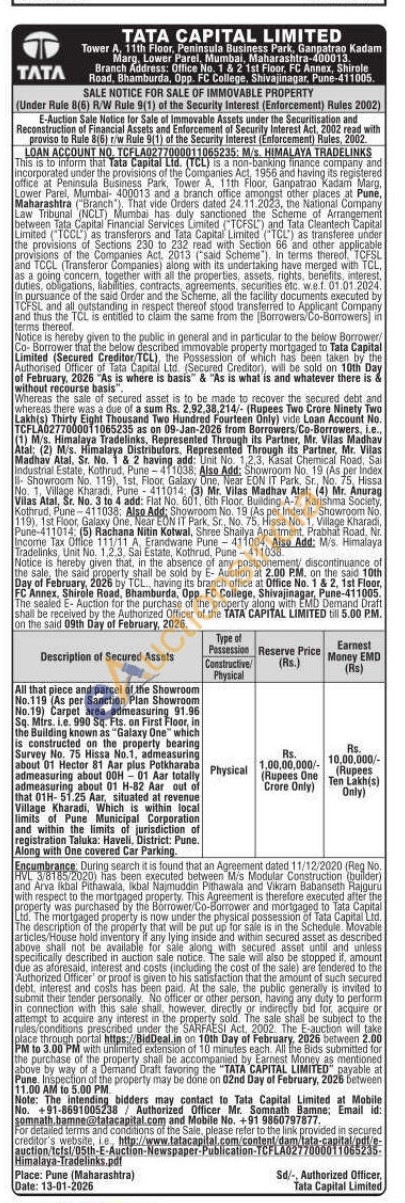 All that piece and parcel of the Showroom No.119 (As per Sanction Plan Showroom No.19) Carpet area admeasuring 91.96 Sq. Mirs. i.e. 990 Sq. Fts. on First Floor, in the Building known as "Galaxy One" which is constructed on the property bearing Survey No. 75 Hissa No.1, admeasuring about 01 Hector 81 Aar plus Potkharaba admeasuring about 00H-01 Aar totally admeasuring about 01 H-82 Aar out of that 01H-51.25 Aar, situated at revenue Village Kharadi, Which is within local limits of Pune Municipal Corporation and within the limits of jurisdiction of registration Taluka: Haveli, District: Pune. Along with One covered Car Parking