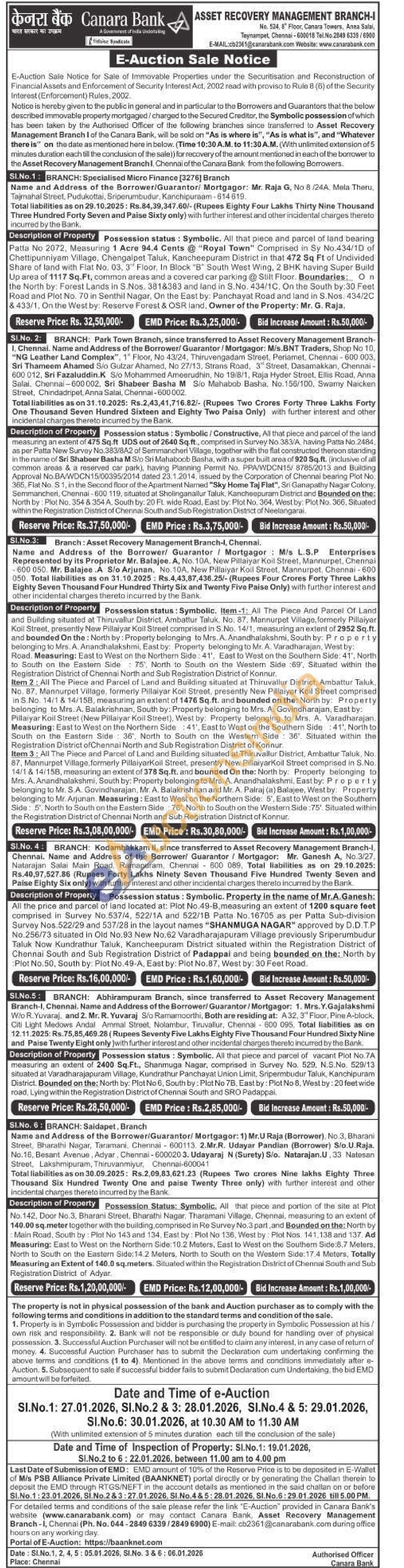 2) All that piece and parcel of the land measuring an extent of 475 Sq.ft UDS out of 2640 Sq.ft., comprised in Survey No.383/A, having Patta No.2484, as per Patta New Survey No.383/8A2 of Semmaricheri Village, together with the flat constructed thereon standing in the name of Sri Shabeer Basha M S/o Sri Mahaboob Basha, with a super built area of 920 Sq.ft. (inclusive of all common areas & a reserved car park), having Planning Permit No. PPA/WDCN15/ 8785/2013 and Building Approval No.BA/WDCN15/00395/2014 dated 23.1.2014, issued by the Corporation of Chennai bearing Plot No. 365, Flat No. S 1, in the Second floor of the Apartment Named "Sky Home Taj Flat", Sri Ganapathy Nagar Colony, Semmancheri, Chennai-600 119, situated at Sholinganailur Taluk, Kancheepuram District and Bounded on the: North by: Plot No. 354 & 354 A. South by: 20 Ft. wide Road, East by: Plot No. 364, West by: Plot No. 366, Situated within the Registration District of Chennai South and Sub Registration District of Neelangaral