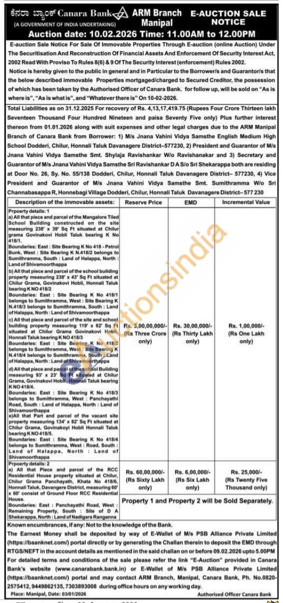 Prpoerty details:1 a) All that piece and parcel of the Mangalore Tiled School Building constructed on the site measuring 238 x 39 Sq Ft situated at Chilur grama Govinakovi Hobil Taluk bearing K. No 418/1 Boundaries: East: Site Bearing K No 418-Patrol Bunk, West: Site Bearing K N.418/2 belongs to Sumithramma, South Land of Halappa, North Land of Shivamoorthappa b) All that piece and parcel of the school building property measuring 238 x 43' Sq Ft situated at Chilur Grama, Govinakovi Hobli, Honnali Taluk bearing K NO 418/2 Boundaries: East: Site Bearing K No 418/1 belongs to Sumithramma, West: Site Bearing K N.418/3 belongs to Sumithramma, South: Land of Halappa, North: Land of Shivamoorthappa c) All that piece and parcel of the site and school building property measuring 119 x 82 Sq Ft situated at Chilur Grama Govinakovi Hobli Boundaries: East: Site Bearing K No 418/2 belongs to Sumithramma, West: Site Bearing K N.418/4 belongs to Sumithramma, South: Land of Halappa, North: Land of Shivamoorthappa d) All that piece and parcel of the school Building measuring 93 x 23 Sq Ft situated at Chilur Grama, Govinakovi Hobli, Honnali Taluk bearing KNO 418/4 Boundaries: East Site Bearing K. No 4183 belongs to flumithramma, West: Panchayathi Road, South: Land of Halappa, North: Land of Shivamoorthappa e)All that Part and parcel of the vacant site property measuring 134 x 82' Sq Ft situated at Chilur Grama, Govinakoyi Hobili Honnali Taluk bearing KNO 418/5. Boundaries: East: Site Bearing K No 41814 belongs to Sumithramma, West Road, South: Land of Halappa, North Land of Shivamoorthappa