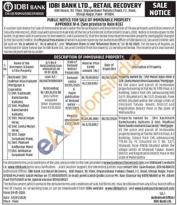 Property owned by: Shri Kashinath Ramchandra Kulkarni & Smt. Madhavi Ramchandra Kulkarni Guarantor/Mortgagor All the piece and parcel of Immovable property bearing at Flat No. 04 First Floor, A-3 Building, Solace Park CHS admeasuring 779.85 Sq. Ft. Situated on S. No. 52/1, Ghorpadi, Pune 411036 Situated within the village Limits of Ghorpadi Taluka Haveli, District and Registration District Pune in the state of Maharashtra