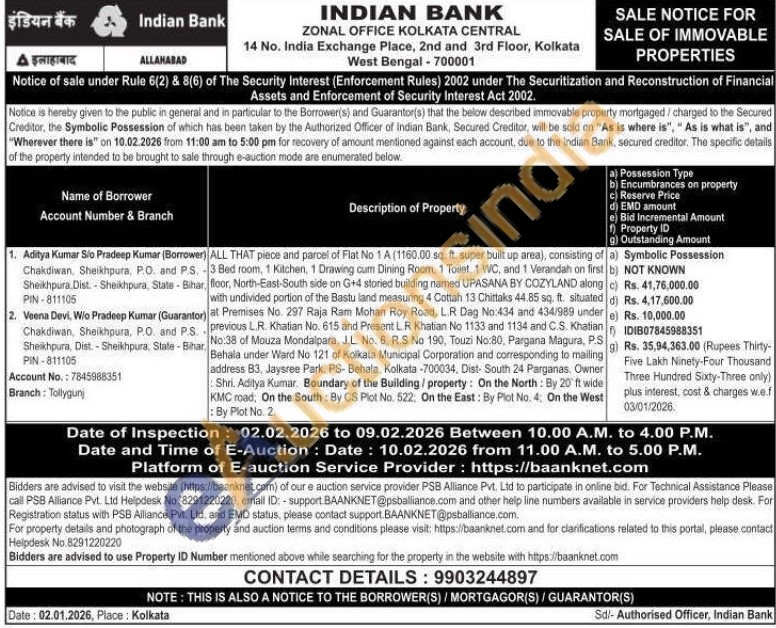 ALL THAT piece and parcel of Flat No 1 A (1160.00 sq. ft. super built up area), consisting of -3 Bed room, 1 Kitchen, 1 Drawing cum Dining Room, 1 Toilet, 1 WC, and 1 Verandah on first floor, North-East-South side on G+4 storied building named UPASANA BY COZYLAND along with undivided portion of the Bastu land measuring 4 Cottah 13 Chittaks 44.85 sq. ft. situated ) at Premises No. 297 Raja Ram Mohan Roy Road, L.R Dag No:434 and 434/989 under previous L.R. Khatian No. 615 and Present LR Khatian No 1133 and 1134 and C.S. Khatian f No:38 of Mouza Mondalpara, J.L. No. 6. R.S No 190, Touzi No:80, Pargana Magura, P.S Behala under Ward No 121 of Kolkata Municipal Corporation and corresponding to mailing address B3, Jaysree Park, PS- Behala, Kolkata -700034, Dist- South 24 Parganas, Owner Shri. Aditya Kumar. Boundary of the Building/property: On the North: By 20 ft wide KMC road; On the South: By CS Plot No. 522. On the East: By Plot No. 4, On the West : By Plot No. 2