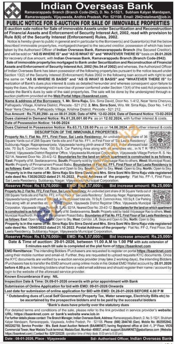 DESCRIPTION OF THE IMMOVABLE PROPERTIES : Property No.1: Flat No. FF1, First Floor, Sai Leela Residency: An undivided joint share of 36 Square Yards out of 288 Square Yards site and Flat No. FF1, in First Floor of "Sai Leela Residency", Subburaju Nagar, Rajarajeswaripeta, Vijayawada having plinth area of 706 Sq.ft. in the aforesaid total site, 70 Sq.ft. Common Area, 100 Sq.ft. Car Parking Area along with all amenities etc., in NTR District. Vijayawada District Registrar Office, Vijayawada Municipal Corporation, Vijayawada Village Portion R. S. No. 92/1A, Nearest Door No. 20-4/2-12. Boundaries for the land on which apartment is constructed is as follows; East: Property of M. Seetaravamma, South: Property sold by Vaddi Vidyasagar Rao to others, West: Municipal Road, North: Property of Pinnamaneni Prasad Babu. Boundaries of Flat No. FF1, First Floor of Sai Leela Residency is as follows; East: Corridor, Lift, Steps and Open to Sky, South: Open to Sky, West: Open to Sky, North: Open to Sky. Property is in the name of Mr. Sirra Raju S/o Sirra David and Mrs. Sirra Soni W/o Sirra Raju vide registered sale deed No.13026/2022 dated 21.10.2022. Postal Address of the property: Flat No. FF-1, First Floor, Sai Leela Residency, Subbaraju Nagar, Vijayawada Municipal Corporation