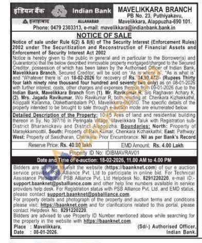 Detailed Description of the Property: 10.45 Ares of land and residential building mereon in Sy No 387/16 in Peringala Village, Mavelikkara Taluk with Registration sub-District Bharanickavu and District Alappuzha Boundaries: North: Property of Maraykkamootti, South: Property of Ravi Kumar, Chenkara Kizhakkathil, East: Pathway, West: Property of Sasidharan, Chenkara. Prior Encumbrance: Nil as per Bank's Record