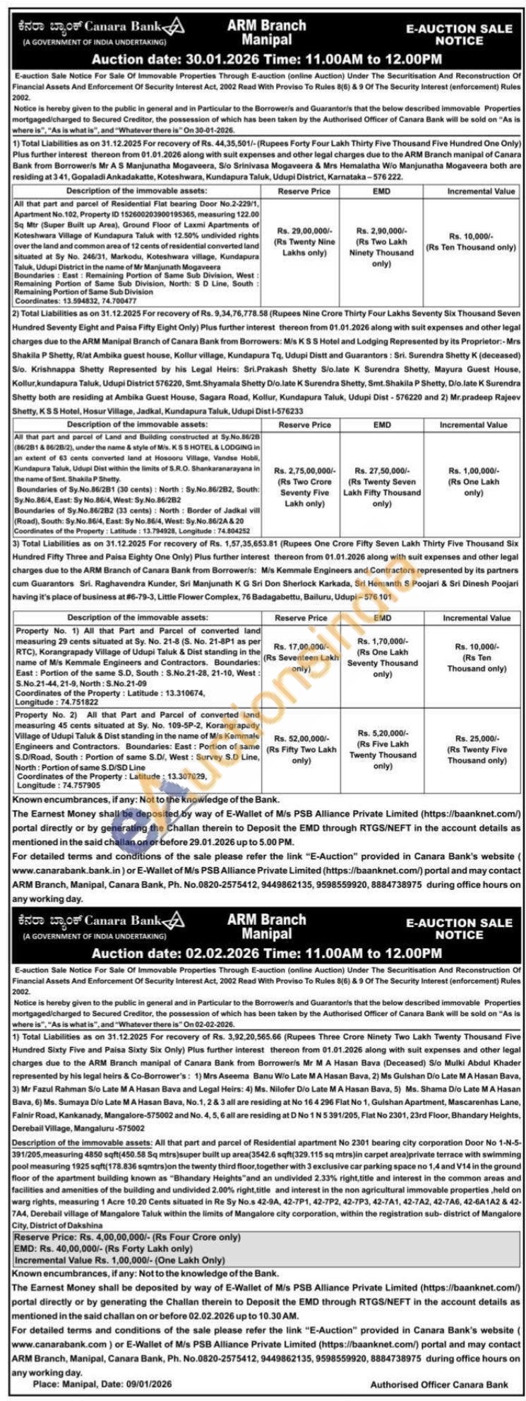 All that part and parcel of Residential Flat bearing Door No.2-229/1, Apartment No. 102, Property ID 152600203900195365, measuring 122.00 Sq Mtr (Super Built up Area), Ground Floor of Laxmi Apartments of Koteshwara Village of Kundapura Taluk with 12.50% undivided rights over the land and common area of 12 cents of residential converted land situated at Sy No. 246/31, Markodu, Koteshwara village, Kundapura Taluk, Udupi District in the name of Mr Manjunath Mogaveera Boundaries: East: Remaining Portion of Same Sub Division, West: Remaining Portion of Same Sub Division, North: SD Line, South: Remaining Portion of Same Sub Division Coordinates: 13.594832, 74.700477