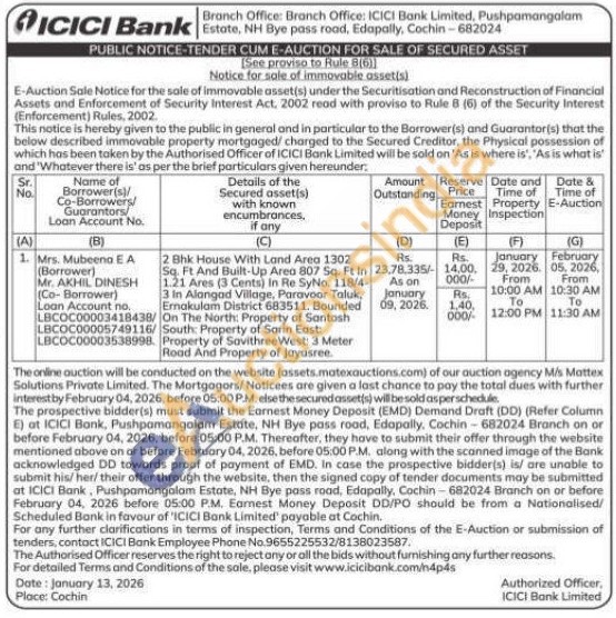 2 Bhk House With Land Area 1302 Sq. Ft And Built-Up Area 807 Sq. Ft In 1.21 Ares (3 Cents) In Re SyNo. 118/4-3 in Alangad Village, Paravoor Taluk, Ernakulam District 683511. Bounded On The North: Property of Santosh South: Property of Sarin East: Property of SavithreeWest: 3 Meter Road And Property of Jayasree