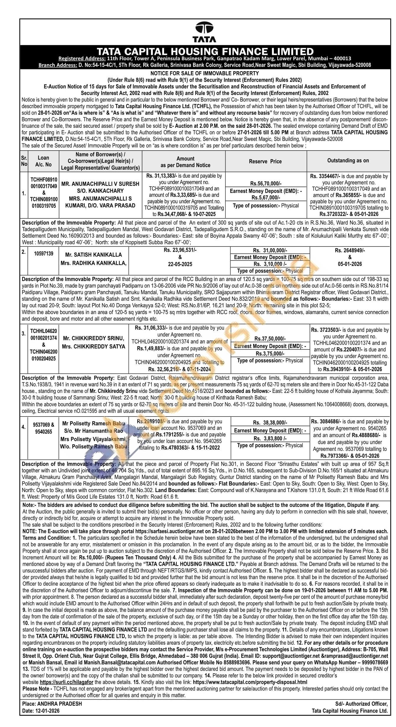 Description of the Immovable Property: All that the piece and parcel of Property Flat No.301, in Second Floor 'Strasthu Estates with buit up area of 957 Sept together with an Undivided joint extent of 46.704 So Yids, out of total extent of 895.16 Sq. Yds, in D.No. 165, subsequent to Sub-Division D.No. 165/1 situated at Atmakuru Vilage, Atmakuru Gram Panchaayt Area, Mangalagi Mandal, Mangaragri Sub Registry, Guntur District standing on the name of Mr Polisetty Ramesh Batu and Mis Polisolly Vijayalakshmi vide Registened Sale Deed No 84/2014 and bounded as follows: Flat Boundaries: - East: Open to Sky, South: Open to Sky West: Open to Sky North: Open to Sky, steps with common comdor, Flat No.302. Land Boundaries: East: Compound wall of K. Narayana and T.Kishore 131.0 ft. South: 21 ft Wide Road 61.6 West Property of Mis Good Life Estates 131.0ft, North Road 01.0