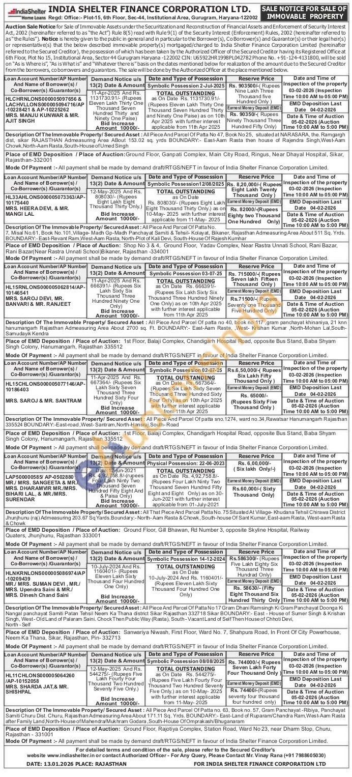 Description Of The Immovable Property/Secured Asset: All Piece And Parcel Of Patta No 47, Book No25, situated at NARASARA, the. Ramgargh dist, sikar RAJASTHAN Admeasuring Area ABout 153.02 sq. yrds BOUNDARY:- East-Aam Rasta then house of Rajendra Singh, West-Aam Chowk, North-Aam Rasta, South-House of Umed Singh