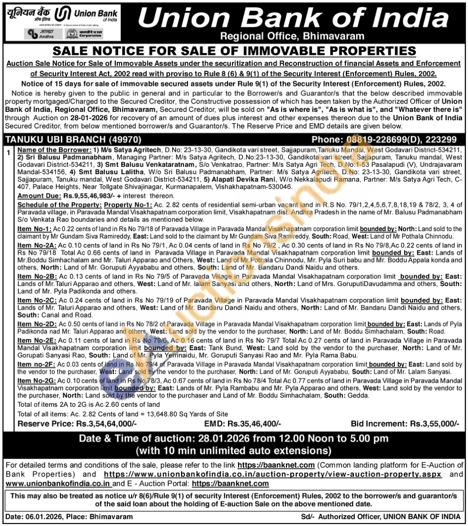 Item no-2F: Ac 0.03 cents of land in Rs No 79/4 of Paravada Village in Paravada Mandal Visakhapatnam corporation limit bounded by: East: Land sold by the vendor to the purchaser, West: Land sold by the vendor to the purchaser, North: Land of Mr. Goruputi Ayyababu, South: Land of Mr. Lalam Sanyasi. Item No-2G: Ac 0.10 cents of land in Rs No 78/3, Ac 0.67 cents of land in Rs No 78/4 Total Ac 0.77 cents of land in Paravada Village in Paravada Mandal Visakhapatnam corporation limit bounded by: East: Lands of Mr. Pyla Rambabu and Mr. Pyla Apparao and others, West: Land sold by the vendor to the purchaser, North: Land sold by the vendor to the purchaser and Land of Mr. Boddu Simhachalam, South: Gedda.