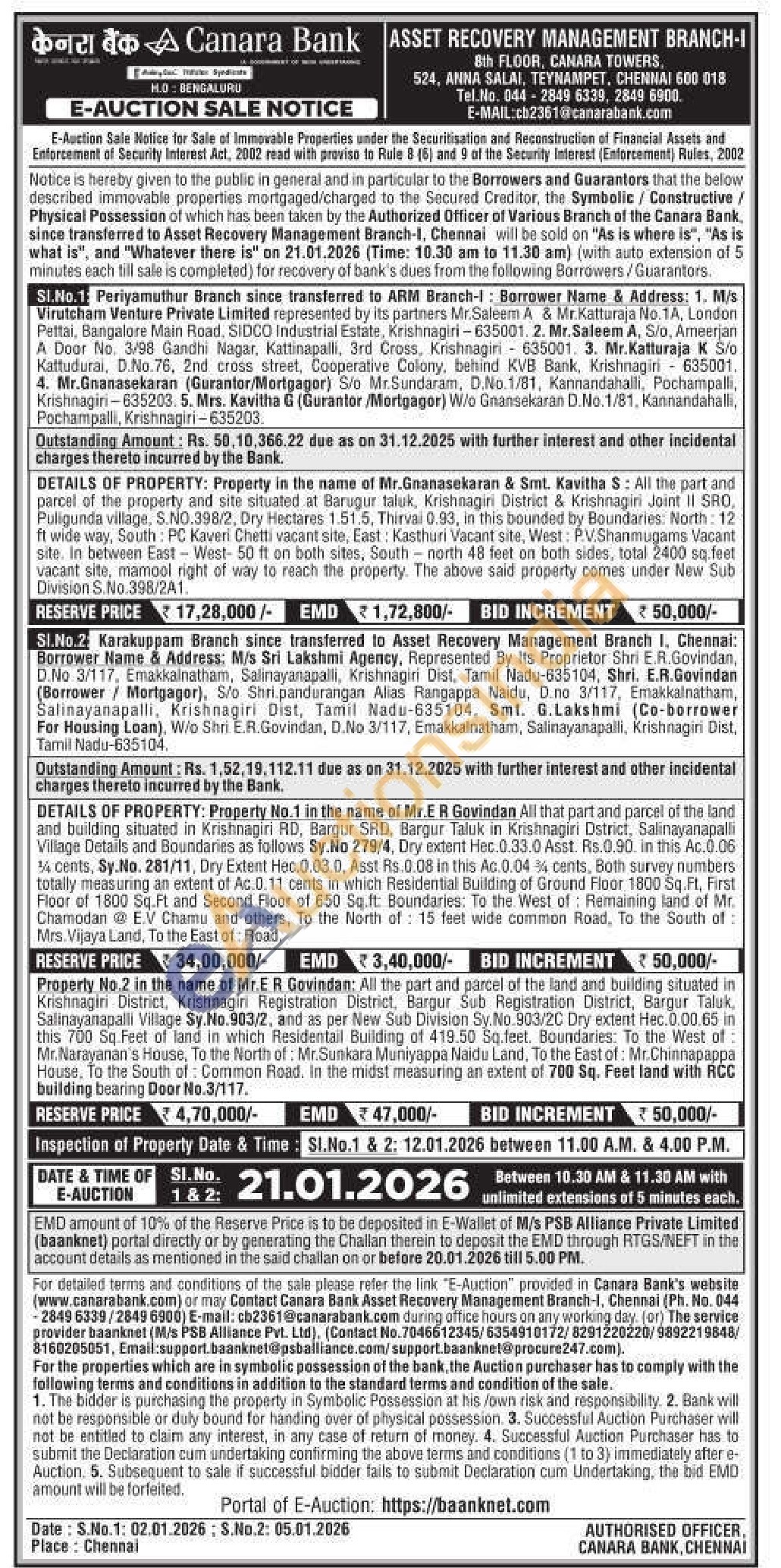 Property No.2 in the name of Mr.E R. Govindan: All the part and parcel of the land and building situated in Krishnagiri District, Krishnagiri Registration District, Bargur Sub Registration District, Bargur Taluk Salinayanapalli Village Sy.No.903/2, and as per New Sub Division Sy. No. 903/20 Dry extent Hec.0.00.65 in this 700 Sq. Feet of land in which Residentail Building of 419.50 Sq feet. Boundaries: To the West of: Mr. Narayanan's House, To the North of Mr. Sunkara Muniyappa Naidu Land, To the East of: Mr.Chinnapappa House, To the South of Common Road. In the midst measuring an extent of 700 Sq. Feet land with RCC building bearing Door No.3/117.