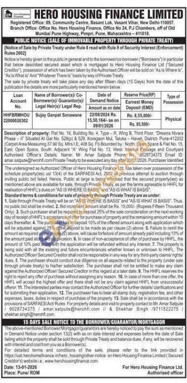 Authorised Officer's Details: Name: Mr Amar Satpute Phone No: 025734375 Email: amar satpute@herohti.com Private Treaty to be executed any day after 30/01/2026 Purchaser Identified