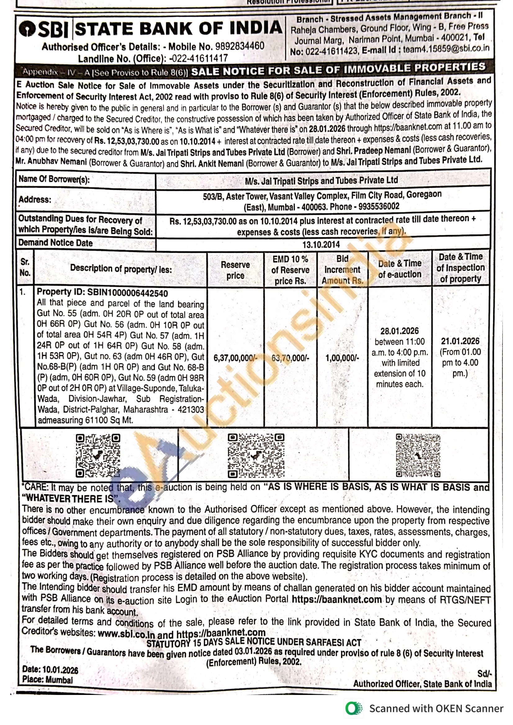 All that piece and parcel of the land bearing Gut No. 55 (adm. OH 20R OP out of total area OH 66R 0P) Gut No. 56 (adm. OH 10R OP out of total area OH 54R 4P) Gut No. 57 (adm. 1H 24R OP out of 1H 64R OP) Gut No. 58 (adm. 1H 53R OP), Gut no. 63 (adm OH 46R OP), Gut No.68-B(P) (adm 1H OR OP) and Gut No. 68-B (P) (adm, OH 60R 0P), Gut No. 59 (adm OH 98R OP out of 2H OR OP) at Village-Suponde, Taluka-Wada, Division-Jawhar, Sub Registration-Wada, District-Palghar, Maharashtra 421303 admeasuring 61100 Sq Mt.