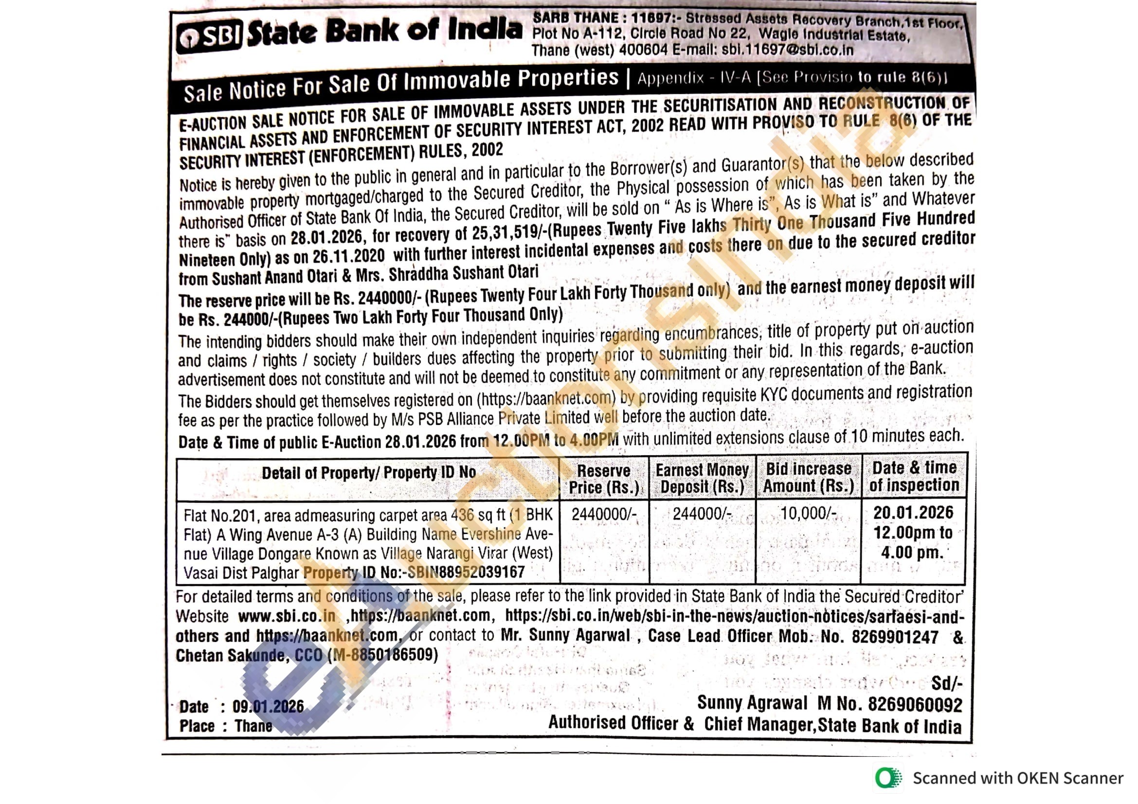 Flat No.201, area admeasuring carpet area 436 sq ft (1 BHK Flat) A Wing Avenue A-3 (A) Building Name Evershine Ave-nue Village Dongare Known as Village Narangi Virar (West) Vasai Dist Palghar Property ID No:-SBIN88952039167