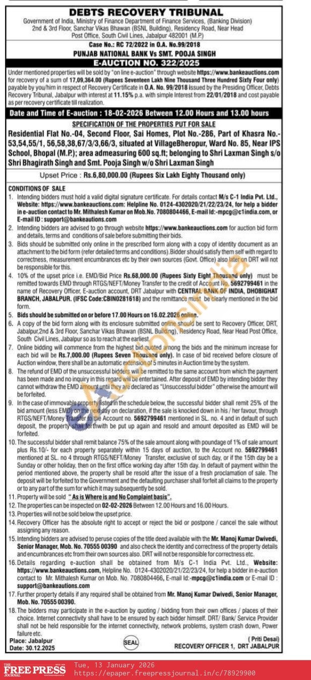 Residential Flat No.-04, Second Floor, Sai Homes, Plot No.-286, Part of Khasra No.-53,54,55/1, 56,58,38,67/3/3,66/3, situated at VillageBheropur, Ward No. 85, Near IPS School, Bhopal (M.P.); area admeasuring 600 sq.ft; belonging to Shri Laxman Singh s/o Shri Bhagirath Singh and Smt. Pooja Singh w/o Shri Laxman Singh
