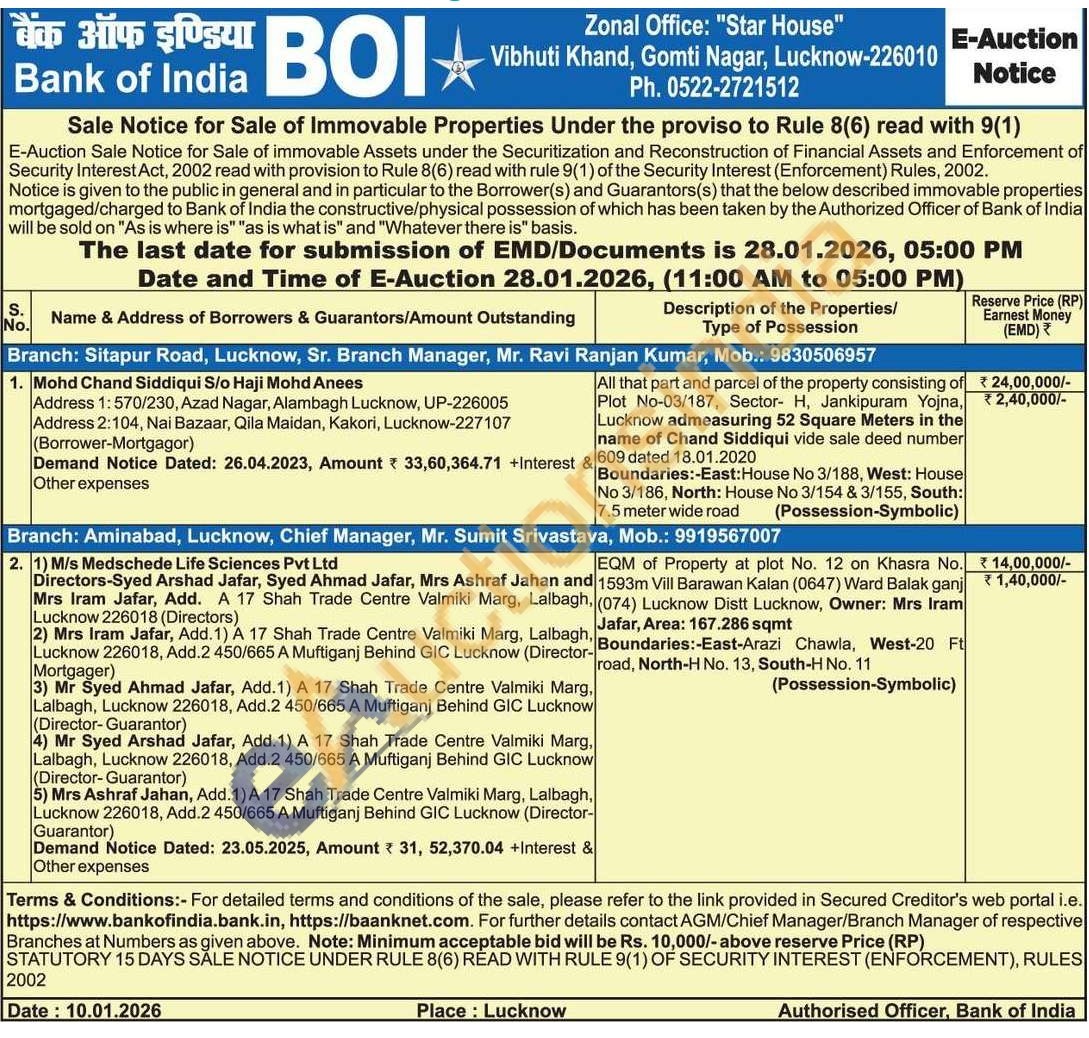 All that part and parcel of the property consisting of Plot No-03/187, Sector- H, Jankipuram Yojna, Lucknow admeasuring 52 Square Meters in the name of Chand Siddiqui vide sale deed number Boundaries:-East: House No 3/188, West: House No 3/186, North: House No 3/154 & 3/155, South: 609 dated 18.01.20207.5 meter wide road (Possession-Symbolic)