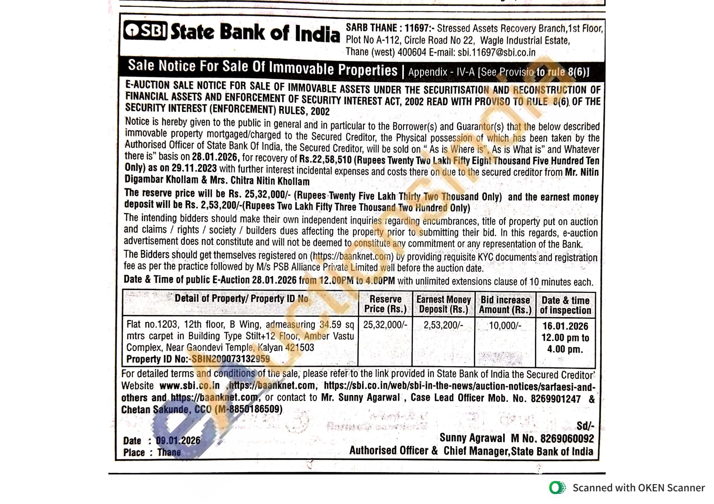 Flat no.1203, 12th floor, B Wing, admeasuring 34.59 sq mtrs carpet in Building Type Stilt+12 Floor, Amber Vastu Complex, Near Gaondevi Temple, Kalyan 421503 Property ID No:-SBIN200073132959