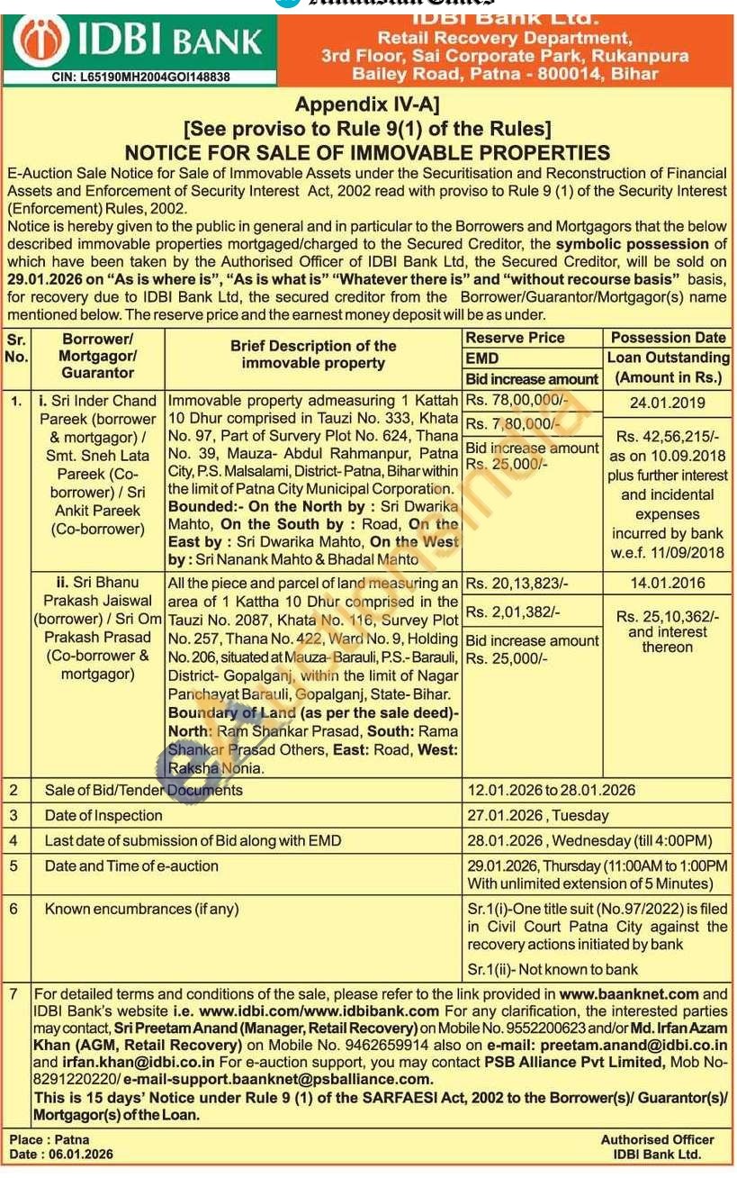 All the piece and parcel of land measuring an area of 1 Kattha 10 Dhur comprised in the Tauzi No. 2087, Khata No. 116, Survey Plot No. 257, Thana No. 422, Ward No. 9, Holding No. 206, situated at Mauza-Barauli, P.S.-Barauli, District- Gopalganj, within the limit of Nagar Panchayat Barauli, Gopalganj, State-Bihar. Boundary of Land (as per the sale deed)-North: Ram Shankar Prasad, South: Rama Shankar Prasad Others, East: Road, West: Raksha Nonia.