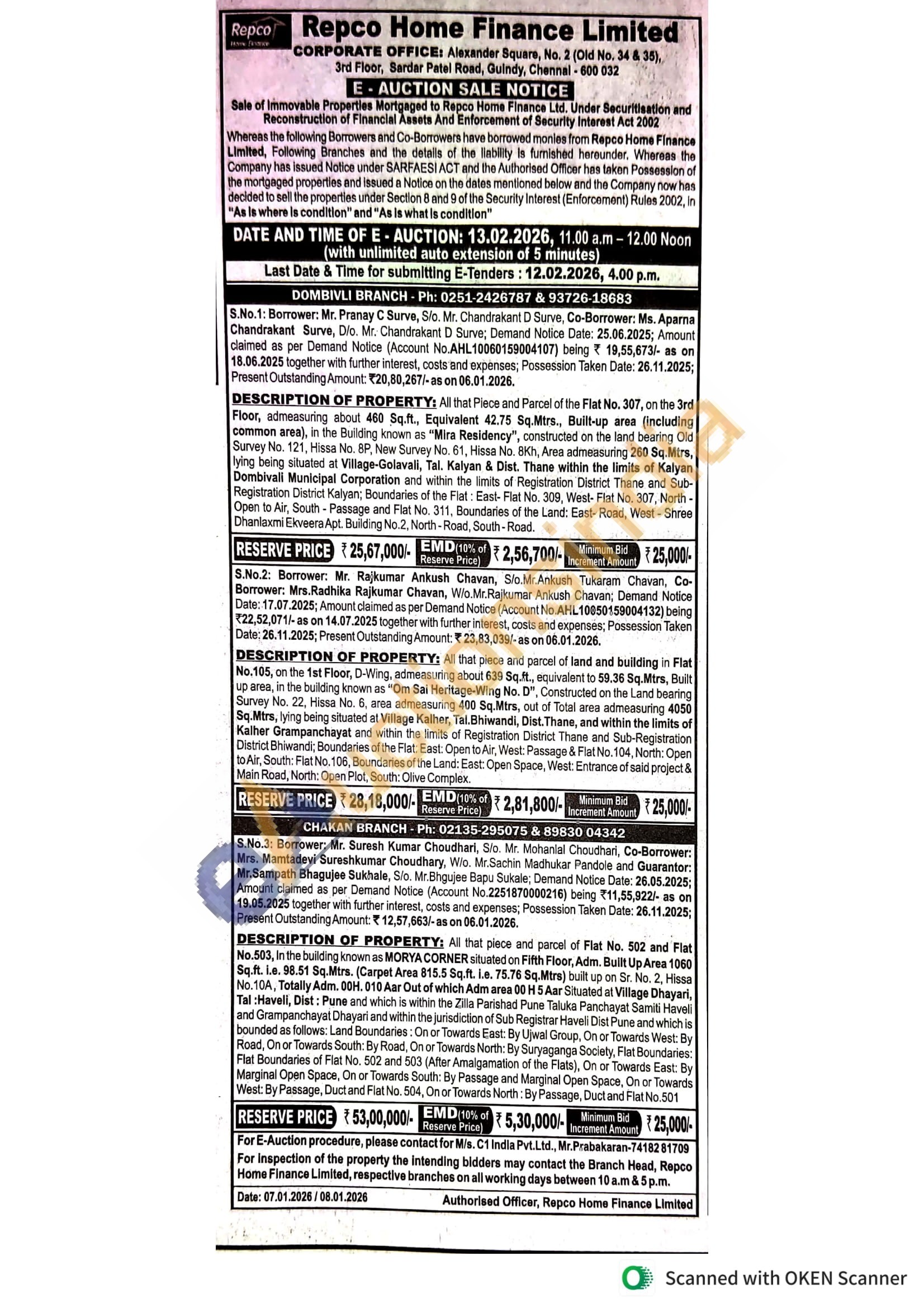 Al that piece and parcel of land and bullding in Flat No.105, on the 1st Floor, D-Wing, admeasuring about 630 Sq.ft., equivalent to 50.36 Sq. Mirs, Buit up area, in the building known as "Om Sal Heritage-Wing No. D", Constructed on the Land bearing Survey No. 22. Hiesa No. 6, ansa admeasuring 400 Sq.Mtrs, out of Total area admeasuring 4050 Sq.Mtrs, lying being situated at Village Kalher, Tal Bhiwandi, Dist. Thane, and within the limits of Kalher Grampanchayat and within the limits of Registration District Thane and Sub-Registration District Bhiwandi Boundarie Boundaries of the Flat. East. Open to Air, West: Passage Passage & Flat No. 104, North: Open to Air, South: Flat No. 106, Boundaries of the Land: East: Open Space, West Entrance of said project & Main Road, North: Open Plot, South: Olive Complex.