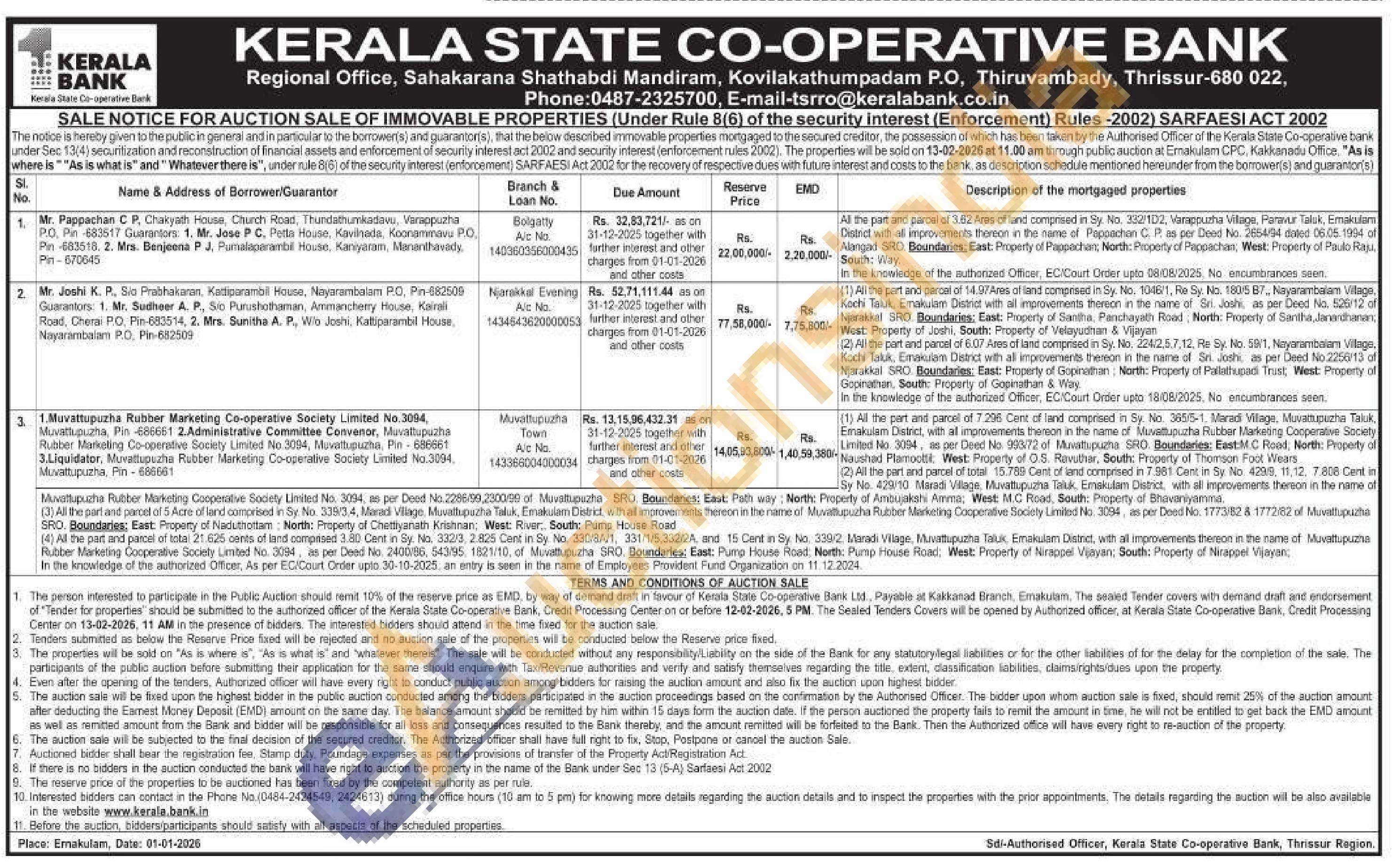 All the part and parcel of 3.62 Ares of land compneed in Sy No. 332102, Varappuzha Vitage, Paravur Taluk, Emakulanı Destrict with all improvements thereon in the name of Pappachan C. P as per Deed No. 2664/94 dated 06.05.1994 of Alangad SRO Boundaries: East: Property of Pappechart North: Property of Pappachan: West: Property of Paulo Ras - South: Way In the knowledge of the authorized Officer, EC Court Order upto 08/08/2025, No encumbrances soon