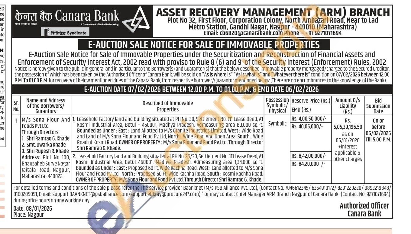 2. Leasehold Factory land and Building situated at PH No. 25/30, Settlement No. 111 Lease Deed, A1 Kosmi Industrial Area, Betul-460001, Madhya Pradesh, Admeasuring area 1,34,000 sq.Ft. Bounded as Under: East: Proposed 60 Ft. Wide Kachha Road, West: Land allotted to M/s Sona Flour and Food Pv.Ltd., North: Proposed 60 Ft. Wide Kachha Road, South Kosmi Kachha Road. OWNER OF PROPERTY: M/s Sona Flour and Food Pvt.Ltd. Through Director Shri Ramrao G. Khade.